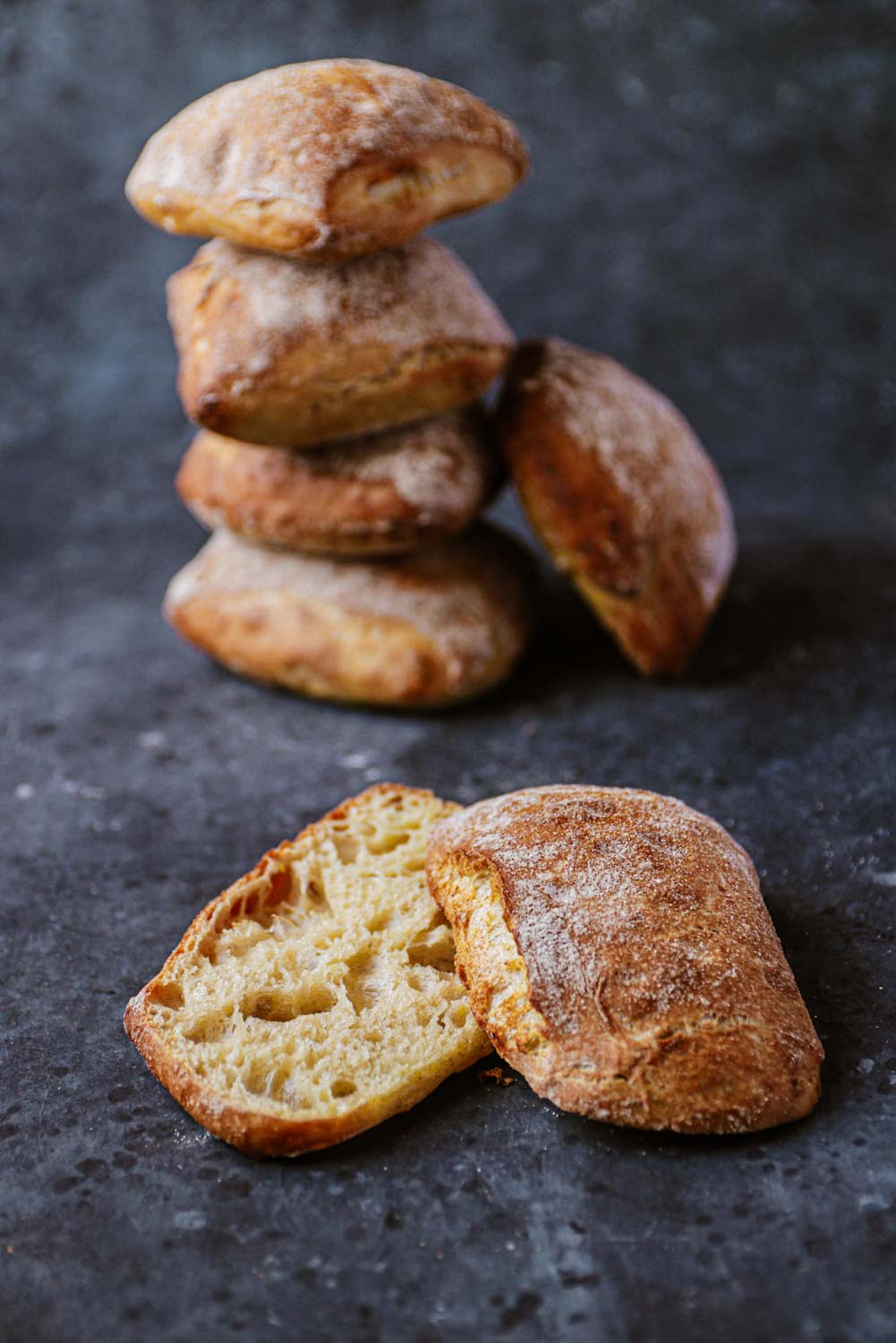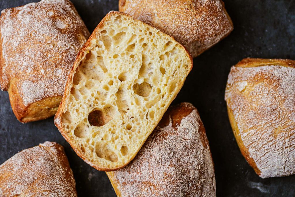 Ein spezieller Vorteig (Biga) bringt viel Aroma und luftige Poren in den Teig. Trotz der relativ kurzen Reifezeit entwickelt sich ein schönes Volumen, wie man es von italienischen Ciabattas kennt. Durch die Zugabe von Kartoffeln wird der Teig noch saftiger und bekommt eine süßliche Note. Außerdem bräunt die Kruste schön. Wichtig bei diesem relativ weichen Teig ist das kontinuierliche Dehnen + Falten in der ersten Hälfte der Teigruhe. So wird der Teig sehr dehnbar, glatt und kann das Volumen gut halten.
